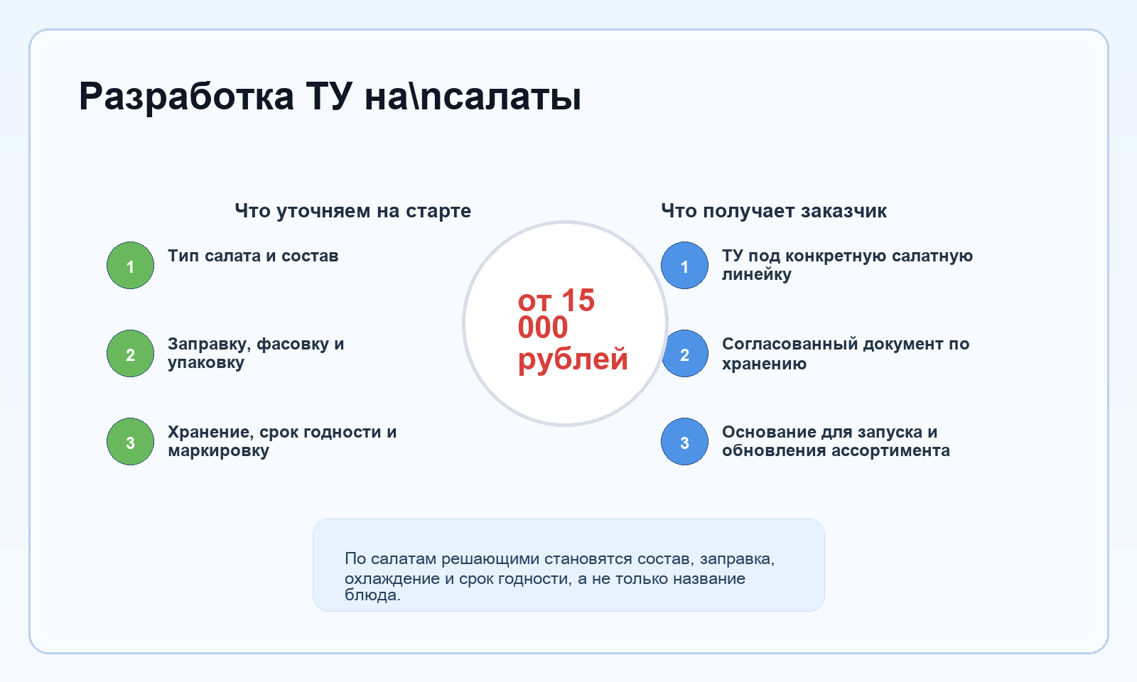 Собираем технические условия на салаты под фактическую рецептуру: состав, заправку, нарезку, фасовку, хранение и потребительскую маркировку.